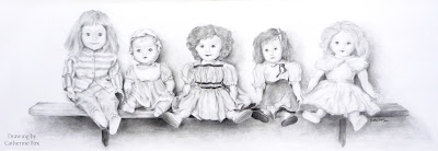 {a drawing my sister did of my mother's five favorite dolls }